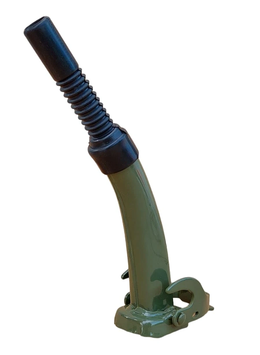 משפך מתכתי לג’ריקן דלק בסגנון צבאי, עשוי פלדה מצופה בצבע מגן ירוק זית.